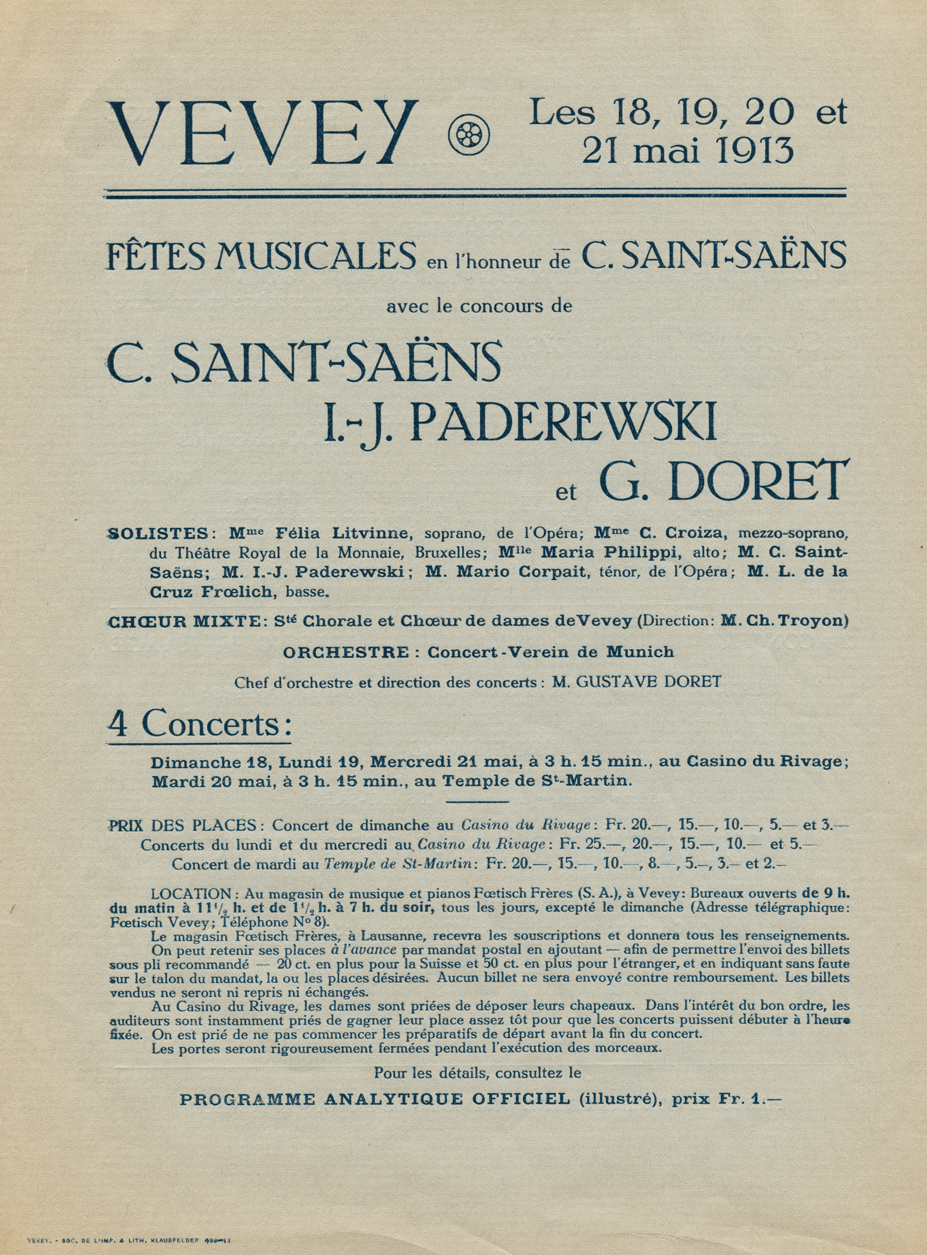 Ignacy Paderewski and Camille Saint-Saëns met at the Casino du Rivage during the four-day festival – from 18th to 21rd May 1913 – inspired by composer Gustave Doret and music aficionado Eugène Couvreu, the Mayor of Vevey. This encounter gave rise to one of the most legendary concerts ever held in Vevey.